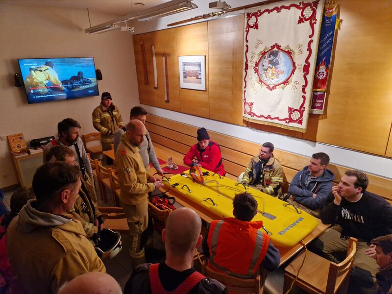 Am 7. Jänner 2026 trafen sich rund 20 Mitglieder im Feuerwehrhaus Kuchl. In einem kurzen theoretischen Teil wurde die Eisrettungsausrüstung vorgestellt sowie ein Übungsvideo zum Einsatz des Eisretter-Boards gezeigt.