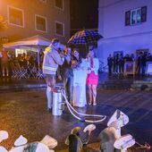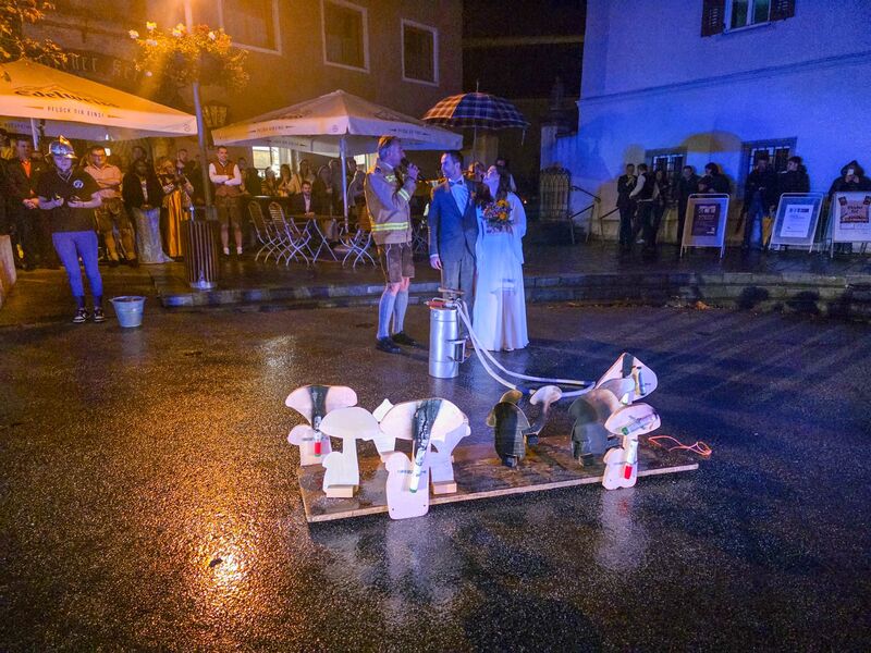 Jedoch durfte das Brautpaar nicht auf die moderne Löschgerätschaften zurückgreifen, sondern bekam zur Brandbekämpfung eine Kübelspritze bereitgestellt. Das Löschmittel fehlte jedoch, alles kein Problem für's eingespielte Brautpaar, Gina unterschrieb den "Kuchler-Feuerwehr-Ehevertrag" anstandslos, Wasser wurde sofort bereitgestellt und das frisch vermählte Ehepaar konnte kurz darauf Brand aus melden. Die wertvolle Pilzzucht wurde in aller letzter Sekunde gerettet!