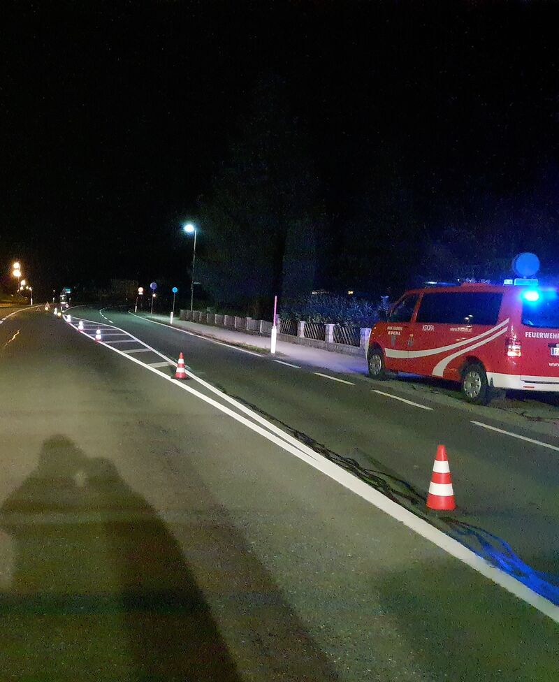 Noch während dieser Arbeiten erfolgte eine zweite Alarmierung: Auf der B159 wurde eine Ölspur gemeldet. Der Tank Kuchl, Last Kuchl und Bus Kuchl rückten daraufhin sofort aus; nach dem Abschluss des ersten Einsatzes folgte auch der Rüstlösch Kuchl zur Unterstützung. Die betroffene Strecke wurde abgesichert und die Fahrbahn mit Ölbindemittel gereinigt. Nach ca. eineinhalb Stunden waren beide Einsätze beendet und die Kräfte konnten wieder einrücken.